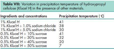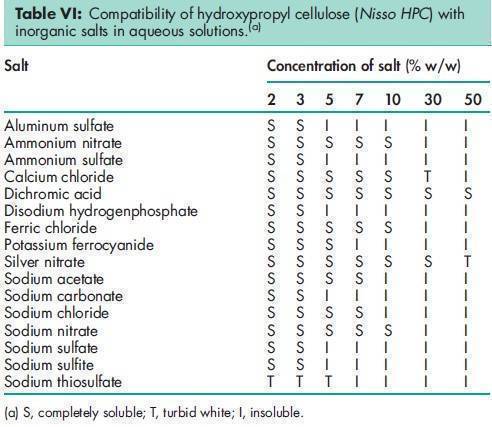 Hydroxypropyl cellulose in solution demonstrates some incompatibility with substituted phenol derivatives, such as methylparaben and propylparaben. The presence of anionic polymers may increase the viscosity of hydroxypropyl cellulose solutions. The compatibility of hydroxypropyl cellulose with inorganic salts varies depending upon the salt and its concentration; see Table VI. Hydroxypropyl cellulose may not tolerate high concentrations of other dissolved materials. The balance of the hydrophilic–lipophilic properties of the polymer, which are required for dual solubility, reduces its ability to hydrate with water and it therefore tends to be salted out in the presence of high concentrations of other dissolved materials. The precipitation temperature of hydroxypropyl cellulose is lower in the presence of relatively high concentrations of other dissolved materials that compete for the water in the system; see Table VII.