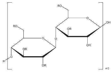 R is H or [CH2CH(CH3)O]mH where m is a common integral number of cellulose derivatives. Hydroxypropyl cellulose is an ether of cellulose where some of the hydroxyl groups of the cellulose have been hydroxypropylated forming –OCH2CH(OH)CH3 groups. The average number of hydroxyl groups in the glucose ring substituted is referred to as the degree of substitution (DS). Complete substitution would provide a DS of 3.0. Because the hydroxypropyl group added contains a hydroxyl group, this can also be etherified during preparation of hydroxypropyl cellulose. When this occurs, the number of moles of hydroxypropyl groups per glucose ring, or moles of substitution (MS), can be higher than 3. Hydroxypropyl cellulose must have an MS value of approximately 4 in order to have good solubility in water.