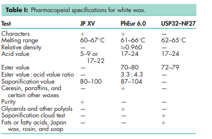 White wax is a chemically bleached form of yellow wax and is used in similar applications: for example, to increase the consistency of creams and ointments, and to stabilize water-in-oil emulsions. White wax is used to polish sugar-coated tablets and to adjust the melting point of suppositories. White wax is also used as a film coating in sustained-release tablets.(1) White beeswax microspheres may be used in oral dosage forms to retard the absorption of an active ingredient from the stomach, allowing the majority of absorption to occur in the intestinal tract. Wax coatings can also be used to affect the release of drug from ion-exchange resin beads.(2–4)