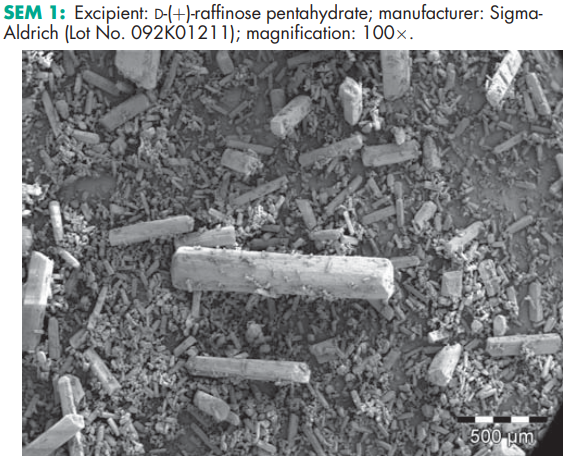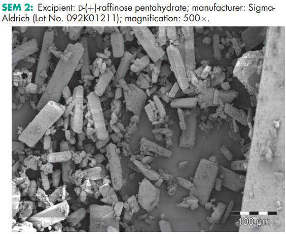 Raffinose has been shown to accumulate in organisms that can survive extreme desiccation, and has therefore been examined as an excipient in stabilizing co-lyophilized protein and labile preparations during storage at elevated temperatures.(25,26) When exposed to elevated relative humidity (RH) of 75% at 258C, raffinose has been shown to form different hydrate levels.(27) Raffinose is indigestible by humans because of a lack of an agalactosidase and undergoes fermentation in the colon, causing production of carbon dioxide, hydrogen, and methane gases.(10) The PubChem Compound ID (CID) for raffinose includes 10542, 219993, and 439242