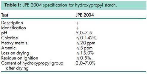 Hydroxypropyl starch–methyl methacrylate (HS-MMA) has been used experimentally in hydrophilic matrices produced by direct compression.(4) Pregelatinized hydroxypropyl starch has been shown to exhibit good disintegrating properties, and can be used as a binder in wet granulation.(7) Although it is not currently included in the pharmacopeias, a specification for hydroxypropyl starch is included in the Japanese Pharmaceutical Excipients (JPE); see Table I.(8) Hydroxypropyl starch is compatible with cationic ingredients (monovalent, divalent), oils, emollients, and silicone. The EINECS number for hydroxypropyl starch is 232-679-6. The PubChem Compound ID (CID) for hydroxypropyl starch is 24847857.