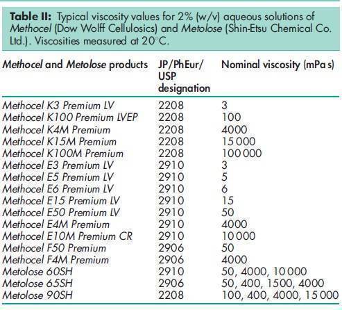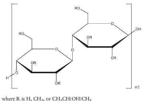 The PhEur 6.3 describes hypromellose as a partlyO-methylated and O-(2-hydroxypropylated) cellulose. It is available in several grades that vary in viscosity and extent of substitution. Grades may be distinguished by appending a number indicative of the apparent viscosity, in mPa s, of a 2% w/w aqueous solution at 208C. Hypromellose defined in the USP 32 specifies the substitution type by appending a four-digit number to the nonproprietary name: e.g. hypromellose 1828. The first two digits refer to the approximate percentage content of the methoxy group (OCH3). The second two digits refer to the approximate percentage content of the hydroxypropoxy group (OCH2CH(OH)CH3), calculated on a dried basis. It contains methoxy and hydroxypropoxy groups conforming to the limits for the various types of hypromellose; Molecular weight is approximately 10 000–1 500 000.