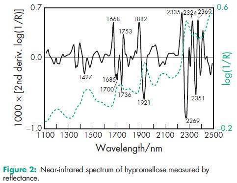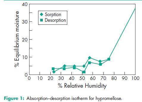 Acidity/alkalinity pH = 5.0–8.0 for a 2% w/w aqueous solution. Ash <_1.5% Autoignition temperature 3608C Density (bulk) 0.341 g/cm3 Density (tapped) 0.557 g/cm3 Density (true) 1.326 g/cm3 Melting point Browns at 190–2008C; chars at 225–2308C. Glass transition temperature is 170–1808C. Moisture content Hypromellose absorbs moisture from the atmosphere; the amount of water absorbed depends upon the initial moisture content and the temperature and relative humidity of the surrounding air. See Figure 1. NIR spectra see Figure 2. Solubility Soluble in cold water, forming a viscous colloidal solution; practically insoluble in hot water, chloroform, ethanol (95%), and ether, but soluble in mixtures of ethanol and dichloromethane, mixtures of methanol and dichloromethane, and mixtures of water and alcohol. Certain grades of hypromellose are soluble in aqueous acetone solutions, mixtures of dichloromethane and propan-2-ol, and other organic solvents. Some grades are swellable in ethanol.(14) See also Section 11. Specific gravity 1.26 Viscosity (dynamic) A wide range of viscosity types are commercially available. Aqueous solutions are most commonly prepared, although hypromellose may also be dissolved in aqueous alcohols such as ethanol and propan-2-ol provided the alcohol content is less than 50% w/w. Dichloromethane and ethanol mixtures may also be used to prepare viscous hypromellose solutions. Solutions prepared using organic solvents tend to be more viscous; increasing concentration also produces more viscous solutions; see Table II. To prepare an aqueous solution, it is recommended that hypromellose is dispersed and thoroughly hydrated in about 20–30% of the required amount of water. The water should be vigorously stirred and heated to 80–908C, and then the hypromellose should be added. The heat source can be removed once the hypromellose has been thoroughly dispersed into the hot water. Sufficient cold water should then be added to produce the required volume while continuing to stir. When aqueous/organic cosolvent mixtures are used for solution preparation, hypromellose should first be dispersed into the organic solvent at a ratio of 5–8 parts of solvent to 1 part of hypromellose. Cold water is then added to produce the final volume. Examples of suitable water-miscible organic solvents include ethanol and glycols. A similar preparation procedure should be used when ethanol and dichloromethane constitute a completely organic cosolvent mixture.