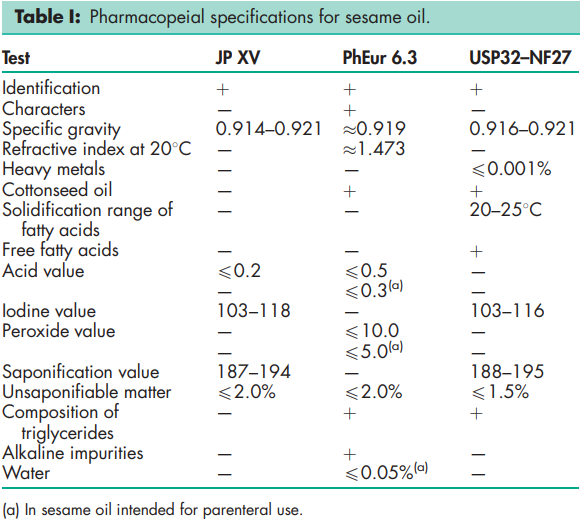BP: Refined Sesame Oil JP: Sesame Oil PhEur: Sesame Oil, Refined USP-NF: Sesame Oil