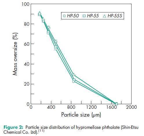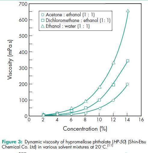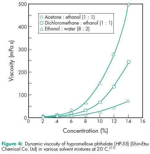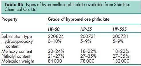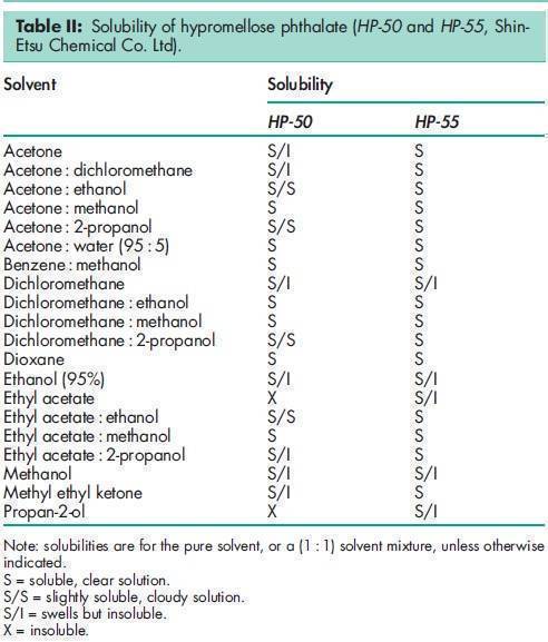 Hypromellose phthalate is one of the materials that have been selected for harmonization by the Pharmacopeial Discussion Group. For further information see the General Information Chapter <1196> in the USP32–NF27, the General Chapter 5.8 in PhEur 6.0, along with the ‘State ofWork’ document on the PhEur EDQM website, and also the General Information Chapter 8 in the JP XV. Various grades of hypromellose phthalate are available with differing degrees of substitution and physical properties, e.g. grades HP-50, HP-55, and HP-55S (Shin-Etsu Chemical Co. Ltd). See Table III. The number following ‘HP’ in each grade designation refers to the pH value (x10) at which the polymer dissolves in aqueous buffer solutions. The designation ‘S’ in HP-55S indicates a higher molecular weight grade, which produces films with a greater resistance to cracking. In the USA, the substitution type is indicated by a six digit number: the first two digits represent the approximate percentage content of methoxy groups; the next two digits represent the approximate percentage content of hydroxypropoxy groups; and the final two digits represent the approximate percentage content of phthalyl groups. To dissolve hypromellose phthalate in acetone : ethanol (95%) or dichloromethane : alcohol solvent systems, the hypromellose phthalate should first be well dispersed in alcohol before adding acetone or dichloromethane. When using acetone : dichloromethane, hypromellose phthalate should be first dispersed in the dichloromethane and then the acetone added to the system.