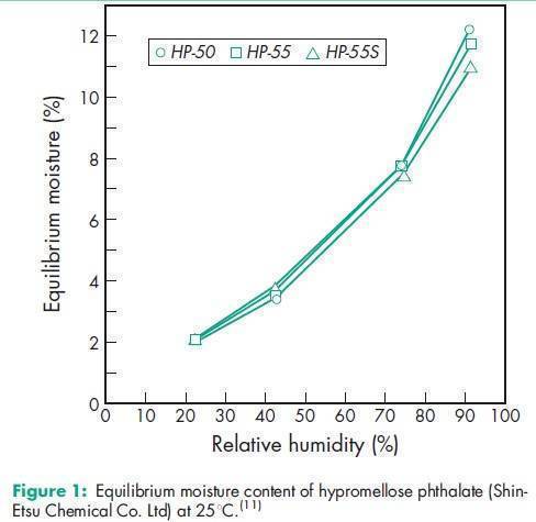 Angle of repose 378 for HP-50; 398 for HP-55; 388 for HP-55S.(11) Density 1.82 g/cm3 for HP-50; 1.65 g/cm3 for HP-55.(11) Density (bulk) 0.278 g/cm3 for HP-50; 0.275 g/cm3 for HP-55; 0.239 g/cm3 for HP-55S.(11) Density (tapped) 0.343 g/cm3 for HP-50; 0.306 g/cm3 for HP-55; 0.288 g/cm3 for HP-55S.(11) Melting point 1508C. Glass transition temperature is 1378C for HP-50 and 1338C for HP-55.(12) Moisture content Hypromellose phthalate is hygroscopic; it takes up 2–5% of moisture at ambient temperature and humidity conditions. For the moisture sorption isotherm of HP-50 measured at 258C, see Figure 1. Particle size distribution see Figure 2. Solubility Readily soluble in a mixture of acetone and methyl or ethyl alcohol (1 : 1), in a mixture of methyl alcohol and dichloromethane (1 : 1), and in aqueous alkali. Practically insoluble in water and dehydrated alcohol and very slightly soluble in acetone. The solubilities of the HP-50 and HP-55 grades, in various solvents and solvent mixtures, are shown in Table II.(11) Viscosity see Figures 3 and 4.