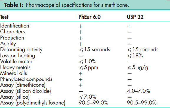 The main use of simethicone as an excipient is as an antifoaming agent in pharmaceutical manufacturing processes, for which 1–50 ppm is used. Therapeutically, simethicone is included in a number of oral pharmaceutical formulations as an antiflatulent, although its therapeutic benefit is questionable.(1,2) It is also included in antacid products such as tablets or capsules.(3–7) In some types of surgical or gastroscopic procedures where gas is used to inflate the body cavity, a defoaming preparation containing simethicone may be used in the area to control foaming of the fluids. When simethicone is used in aqueous formulations, it should be emulsified to ensure compatibility with the aqueous system and components. In the USA, up to 10 ppm of simethicone may be used in food products