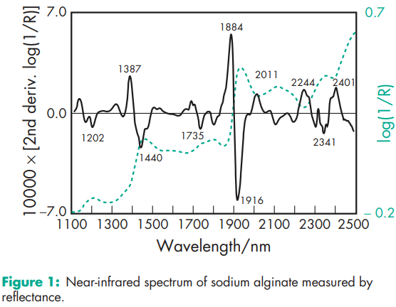 Acidity/alkalinity pH 7.2 (1% w/v aqueous solution) NIR spectra see Figure 1. Solubility Practically insoluble in ethanol (95%), ether, chloroform, and ethanol/water mixtures in which the ethanol content is greater than 30%. Also, practically insoluble in other organic solvents and aqueous acidic solutions in which the pH is less than 3. Slowly soluble in water, forming a viscous colloidal solution. Viscosity (dynamic) Various grades of sodium alginate are commercially available that yield aqueous solutions of varying viscosity. Typically, a 1% w/v aqueous solution, at 208C, will have a viscosity of 20–400 mPa s (20–400 cP). Viscosity may vary depending upon concentration, pH, temperature, or the presence of metal ions.(36–38) Above pH 10, viscosity decreases; see also Alginic Acid