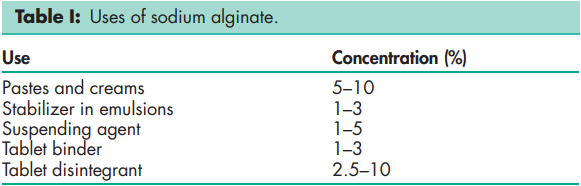 Sodium alginate is used in a variety of oral and topical pharmaceutical formulations.(2) In tablet formulations, sodium alginate may be used as both a binder and disintegrant;(3) it has been used as a diluent in capsule formulations.(4) Sodium alginate has also been used in the preparation of sustained-release oral formulations since it can delay the dissolution of a drug from tablets,(5–7) capsules,(8) and aqueous suspensions.(9) The effects of particle size, viscosity and chemical composition of sodium alginate on drug release from matrix tablets have been described.(10) In topical formulations, sodium alginate is widely used as a thickening and suspending agent in a variety of pastes, creams, and gels, and as a stabilizing agent for oil-in-water emulsions. Recently, sodium alginate has been used for the aqueous microencapsulation of drugs,(11) in contrast with the more conventional microencapsulation techniques which use organicsolvent systems. It has also been used in the formation of nanoparticles.(12) The adhesiveness of hydrogels prepared from sodium alginate has been investigated,(13) and drug release from oral mucosal adhesive tablets,(14,15) buccal gels,(16,17) and vaginal tablets(18) based on sodium alginate have been reported. The esophageal bioadhesion of sodium alginate suspensions may provide a barrier against gastric reflux or site-specific delivery of therapeutic agents.(19,20) Other novel delivery systems containing sodium alginate include ophthalmic solutions that form a gel in situ when administered to the eye;(21,22) an in situ forming gel containing paracetamol for oral administration;(23) nasal delivery systems based on mucoadhesive microspheres;(24) and a freeze-dried device intended for the delivery of bone-growth factors.(25) Hydrogel systems containing alginates have also been investigated for delivery of proteins and peptides.(26) In addition, sodium alginate microspheres have been used in the preparation of a footmouth disease DNA vaccine,(27) and in an oral vaccine for Helicobacter pylori; (28) chitosan nanoparticles coated with sodium alginate may have applications in mucosal vaccine delivery systems.(29) Therapeutically, sodium alginate has been used in combination with an H2-receptor antagonist in the management of gastroesophageal reflux,(30) and as a hemostatic agent in surgical dressings.(31,32) Alginate dressings, used to treat exuding wounds, often contain significant amounts of sodium alginate as this improves the gelling properties.(33) Sponges composed of sodium alginate and chitosan produce a sustained drug release and may be useful as wound dressings or as tissue engineering matrices.(34) Lyophilized wound healing wafers composed of sodium alginate have been found to exhibit large reductions in viscosity following gamma irradiation.(35) Sodium alginate is also used in cosmetics and food products