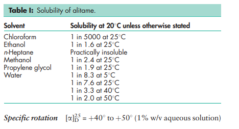 Alitame is stable in dry, room temperature conditions but undergoes degradation at elevated temperatures or when in solution at low pH. Alitame can degrade in a one-stage process to aspartic acid and alanine amide (under harsh conditions) or in a slow two-stage process by first degrading to its b-aspartic isomer and then to aspartic acid and alanine amide. At pH 5–8, alitame solutions at 238C have a half-life of approximately 4 years. At pH 2 and 238C the half-life is 1 year. Alitame should be stored in a well-closed container in a cool, dry place.