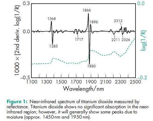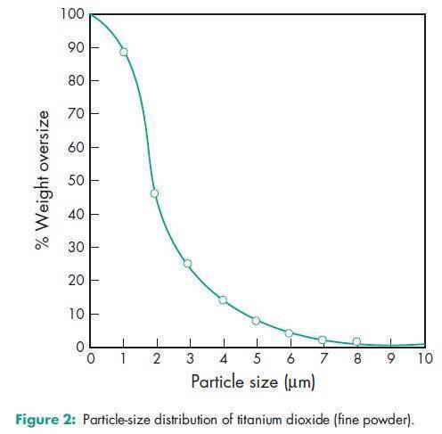 Density (bulk) 0.4–0.62 g/cm3 (5) Density (tapped) 0.625–0.830 g/cm3 (6) Density (true) 3.8–4.1 g/cm3 for anatase; 3.9 g/cm3 for Hombitan FF-Pharma; 3.9–4.2 g/cm3 for rutile. Dielectric constant 48 for anatase; 114 for rutile. Hardness (Mohs) 5–6 for anatase; 6–7 for rutile. See also Section 18. Melting point 18558C Moisture content 0.44% NIR spectra see Figure 1. Particle size distribution Average particle size = 1.05 mm;(5) 0.3 mm for Hombitan FF-Pharma. See also Figures 2 and 3. Refractive index 2.55 for anatase; 2.5 for Hombitan FF-Pharma; 2.76 for rutile. Specific heat 0.71 J/g (0.17 cal/g) for anatase; 0.71 J/g (0.17 cal/g) for rutile. Specific surface area 9.90–10.77m2/g; 10.0m2/g for Hombitan FF-Pharma. Solubility Practically insoluble in dilute sulfuric acid, hydrochloric acid, nitric acid, organic solvents, and water. Soluble in hydrofluoric acid and hot concentrated sulfuric acid. Solubility depends on previous heat treatment; prolonged heating produces a less-soluble material. Tinting strength (Reynolds) 1200–1300 for anatase; 1650–1900 for rutile.