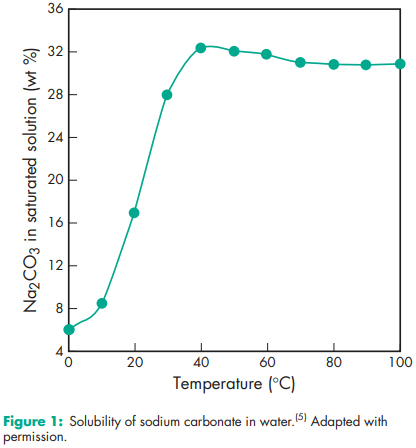 Acidity/alkalinity Strongly alkaline; pH = 11.4 (1% w/v aqueous solution at 258C).(5) Hygroscopicity One mole of sodium carbonate will gradually absorb 1 mole of water (approximately 15%) on exposure to air. Melting point 8518C Refractive index nD 20 = 1.3352 at 1.0% w/w solution; 1.3440 at 5.0% w/w solution; 1.3547 for 10.0% w/w solution.(6) Solubility Freely soluble in water, with solubility initially increasing with temperature and then settling at 30.8% w/w above 808C(5) (see Figure 1). Soluble in glycerin; practically insoluble in ethanol (95%). Specific gravity 2.53