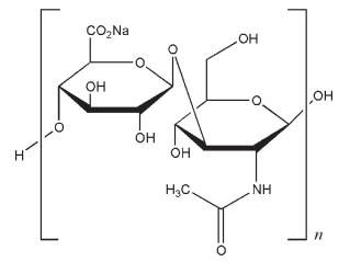 Sodium hyaluronate is the predominant form of hyaluronic acid at physiological pH. The name hyaluronan is used when the polysaccharide is mentioned in general terms, and in the literature the terms hyaluronic acid and sodium hyaluronate are used interchangeably. Hyaluronan is used therapeutically to treat osteoarthritis in the knee, and is an effective treatment for arthritic pain.(1) Crosslinked hyaluronan gels are used as drug delivery systems.(2) Hyaluronan is the most common negatively charged glycosaminoglycan in the human vitreous humor, and is known to interact with polymeric and liposomal DNA complexes,(3) where hyaluronan solutions have been shown to decrease the cellular uptake of complexes.(4) This is useful for enhancing the availability and retention time of drugs administered to the eye. It is immunoneutral, which makes it useful for the attachment of biomaterials for use in tissue engineering and drug delivery systems;(5) it also has important applications in the fields of vascosurgery and vascosupplementation.(6)