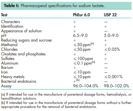 Sodium lactate is widely used in cosmetics,(1,2) food products and pharmaceutical applications including parenteral and topical formulations. Therapeutically, sodium lactate is used in infusions as a component of Ringer-lactate solution; as an alternative for sodium hydrogencarbonate in light acidosis; as a rehydrating agent; and as a carrier for electrolyte concentrates or medicines in perfusion/ infusion solutions