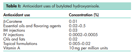 Butylated hydroxyanisole is an antioxidant (see Table I) with some antimicrobial properties.(1–3) It is used in a wide range of cosmetics, foods, and pharmaceuticals. When used in foods, it is used to delay or prevent oxidative rancidity of fats and oils and to prevent loss of activity of oil-soluble vitamins. Butylated hydroxyanisole is frequently used in combination with other antioxidants, particularly butylated hydroxytoluene and alkyl gallates, and with sequestrants or synergists such as citric acid. FDA regulations direct that the total content of antioxidant in vegetable oils and direct food additives shall not exceed 0.02% w/w (200 ppm) of fat or oil content or essential (volatile) oil content of food. USDA regulations require that the total content of antioxidant shall not exceed 0.01% w/w (100 ppm) of any one antioxidant or 0.02% w/w combined total of any antioxidant combination in animal fats. Japanese regulations allow up to 1 g/kg in animal fats.