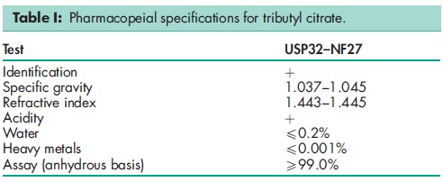 Tributyl citrate is used to plasticize polymers in formulated pharmaceutical coatings. The coating applications include capsules, tablets, beads, and granules for taste masking, immediate release, sustained-release, and enteric formulations.(1–6)
