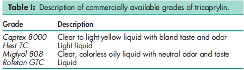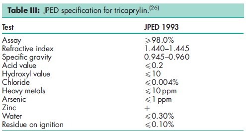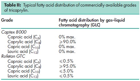 Acid value 40.1 for Captex 8000; 40.1 for Miglyol 808; 40.1 for Rofetan GTC. Ash 0.1% for Rofetan GTC Boiling point 2338C at 133.3 Pa (1 mmHg) Cloud point 5.08C for Rofetan GTC Color 4150.0 (Hazen color index) for Captex 8000; 450.0 (Hazen color index) for Miglyol 808; 450.0 (Hazen color index) for Rofetan GTC. Density 0.94–0.96 g/cm3 for Rofetan GTC at 208C Fatty acid distribution see Table II. Flash point 2468C (open cup) for Captex 8000 Heavy metals 10 mg/kg for Rofetan GTC HLB value 7.0 for Hest TC Hydroxyl value 40.5 for Miglyol 808; 40.5 for Rofetan GTC. Iodine number 40.3 for Miglyol 808; 40.3 for Rofetan GTC. Melting point 9–108C Moisture content 40.1% w/w for Captex 8000; 40.1% w/w for Miglyol 808; 40.1% w/w for Rofetan GTC. Partition coefficient log Pow (octanol : water) = 9.20(3) Peroxide value 40.1 for Miglyol 808; 40.1 for Rofetan GTC. Refractive index 1.447 for Rofetan GTC at 208C Saponification value 345–360 for Captex 8000; 340–370 for Miglyol 808; 340–370 for Rofetan GTC. Solubility Miscible with most organic solvents including ethanol (95%). Captex 8000 is insoluble in water. Specific gravity 0.94 for Captex 8000 at 258C Vapor pressure <133.3 Pa (<1mmHg) for Captex 8000 at 258C Viscosity (dynamic) 23–29 mPa s (23–29 cP) for Miglyol 808 at 208C; 23–29 mPa s (23–29 cP) for Rofetan GTC at 208C. Viscosity (kinematic) 20.9mm2/ s (20.9 cSt) for Captex 8000 at 258C