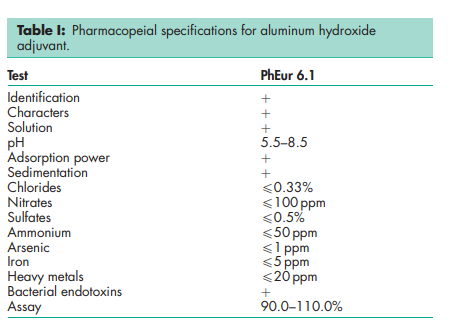 Acidity/alkalinity pH = 5.5–8.5 Particle size distribution Primary particles are fibrous with average dimensions of 4.5 2.2 10 nm. The primary particles form aggregates of 1–10 mm. Point of zero charge pH = 11.4 Protein binding capacity >0.5 mg BSA/mg equivalent Al2O3 Solubility Soluble in alkali hydroxides and mineral acids. Heat may be required to dissolve the aluminum hydroxide adjuvant. Specific surface area 500 m2 /g.(3) X-ray diffractogram Exhibits characteristic x-ray diffraction pattern having diffraction bands at 6.46, 3.18, 2.35, 1.86, 1.44 and 1.31 A˚ .