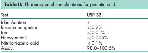 Pentetic acid is mainly used as a chelating agent in the preparation of imaging and contrast agents for radionuclide and magnetic resonance imaging.(1,2) It is also used as a carrier excipient for neutron-capture isotopes in, for example, radiotherapy.(3) Pentetic acid–isotope complexes have also been considered as model active substances in scintigraphic imaging studies.(4) Pentetic acid has been used to chelate metal ions to reduce formation of reactive oxygen species during lyophilization.(5) See also Table I.