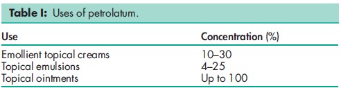 Petrolatum is mainly used in topical pharmaceutical formulations as an emollient-ointment base; it is poorly absorbed by the skin. Petrolatum is also used in creams and transdermal formulations and as an ingredient in lubricant formulations for medicated confectionery together with mineral oil. Therapeutically, sterile gauze dressings containing petrolatum may be used for nonadherent wound dressings or as a packing material.(1) Petrolatum is additionally widely used in cosmetics and in some food applications. See Table I.