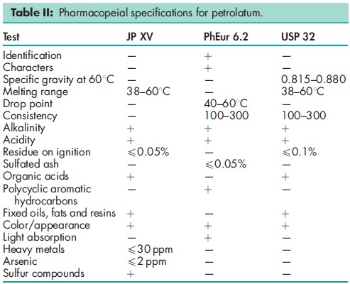 Petrolatum is a purified mixture of semisolid saturated hydrocarbons having the general formula CnH2nþ2, and is obtained from petroleum. The hydrocarbons consist mainly of branched and unbranched chains although some cyclic alkanes and aromatic molecules with paraffin side chains may also be present. The USP 32 and PhEur 6.2 material may contain a suitable stabilizer (antioxidant) that must be stated on the label. The inclusion of a stabilizer is not discussed in the JP XV monograph.