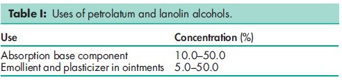 Petrolatum and lanolin alcohols is a soft solid used in topical pharmaceutical formulations and cosmetics as an ointment base with emollient properties. It is also used in the preparation of creams and lotions. Petrolatum and lanolin alcohols can be used to absorb wound exudates. See Table I.