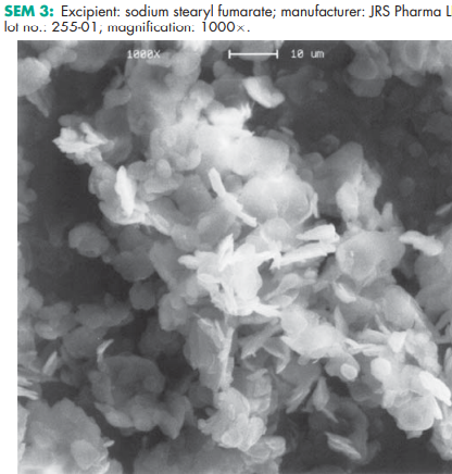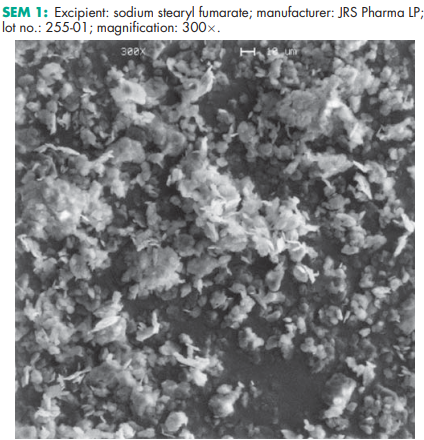 Sodium stearyl fumarate is a fine, white powder with agglomerates of flat, circular-shaped particles.