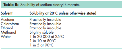 Sodium stearyl fumarate is supplied in a pure form and is often of value when the less pure stearate-type lubricants are unsuitable owing to chemical incompatibility. Sodium stearyl fumarate is less hydrophobic than magnesium stearate or stearic acid and has a less retardant effect on tablet dissolution than magnesium stearate. A specification for sodium stearyl fumarate is contained in the Food Chemicals Codex (FCC).(16) The EINECS number for sodium stearyl fumarate is 223-781-1. The PubChem Compound ID (CID) for sodium stearyl fumarate is 23665634.