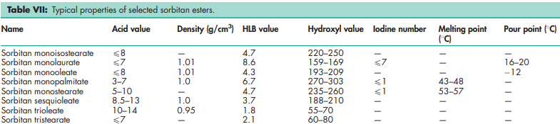 Acid value see Table VII. Density see Table VII. Flash point >1498C HLB value see Table VII. Hydroxyl value see Table VII. Iodine number see Table VII. Melting point see Table VII. Moisture content see Table VIII. NIR spectra see Figure 1. Pour point see Table VII. Saponification value see Table VIII. Solubility Sorbitan esters are generally soluble or dispersible in oils; they are also soluble in most organic solvents. In water, although insoluble, they are generally dispersible.