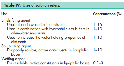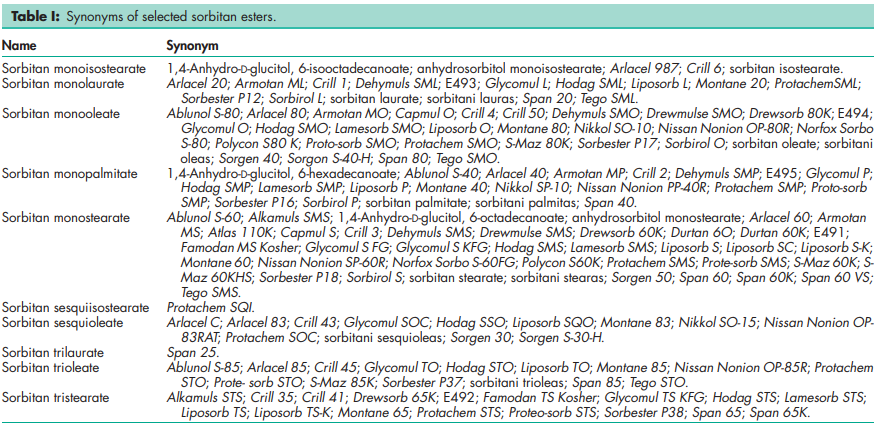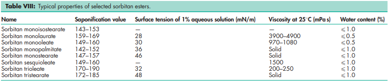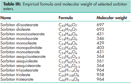 Sorbitan monoesters are a series of mixtures of partial esters of sorbitol and its mono- and dianhydrides with fatty acids. Sorbitan diesters are a series of mixtures of partial esters of sorbitol and its monoanhydride with fatty acids. Sorbitan esters are widely used in cosmetics, food products, and pharmaceutical formulations as lipophilic nonionic surfactants. They are mainly used in pharmaceutical formulations as emulsifying agents in the preparation of creams, emulsions, and ointments for topical application. When used alone, sorbitan esters produce stable water-in-oil emulsions and microemulsions, but are frequently used in combination with varying proportions of a polysorbate to produce water-in-oil or oil-in-water emulsions or creams of varying consistencies, and also in self-emulsifying drug delivery systems for poorly soluble compounds.(1) Sorbitan monolaurate, sorbitan monopalmitate and sorbitan trioleate have also been used at concentrations of 0.01–0.05% w/v in the preparation of an emulsion for intramuscular administration.