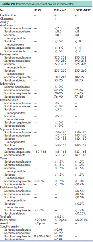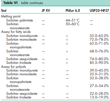 BP: Sorbitan Laurate Sorbitan Oleate Sorbitan Palmitate Sorbitan Stearate Sorbitan Trioleate JP: Sorbitan Sesquioleate PhEur: Sorbitan Laurate Sorbitan Oleate Sorbitan Palmitate Sorbitan Sesquioleate Sorbitan Stearate Sorbitan Trioleate USP-NF: Sorbitan Monolaurate (sorbitan, esters monodecanoate) Sorbitan Monooleate Sorbitan Monopalmitate Sorbitan Monostearate Sorbitan Sesquioleate Sorbitan Trioleate