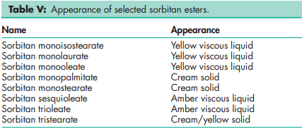 Sorbitan esters occur as cream- to amber-colored liquids or solids with a distinctive odor and taste;