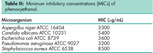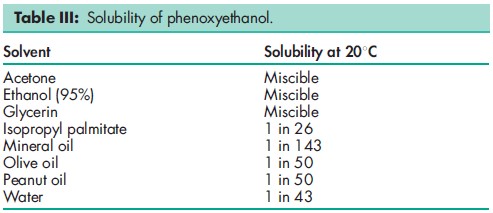 Acidity/alkalinity pH = 6.0 for a 1% v/v aqueous solution. Antimicrobial activity Phenoxyethanol is an antibacterial preservative effective over a wide pH range against strains of Pseudomonas aeruginosa and to a lesser extent against Proteus vulgaris and other Gram-negative organisms. It is most frequently used in combination with other preservatives, such as parabens, to obtain a wider spectrum of antimicrobial activity.(6–8) See also Section 12. For reported minimum inhibitory concentrations (MICs) see Table II.(9,10) Autoignition temperature 1358C Boiling point 245.28C Dissociation constant pKa = 15.1(11) Flash point 1218C (open cup) Melting point 148C Partition coefficients Octanol : water = 1.16;(12) Isopropyl palmitate : water = 2.9;(13) Mineral oil : water = 0.3;(13) Peanut oil : water = 2.6.(13) Refractive index nD 20 = 1.537–1.539 Solubility see Table III. Specific gravity 1.11 at 208C