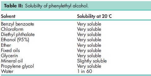 Antimicrobial activity Phenylethyl alcohol has moderate antimicrobial activity although it is relatively slow acting; it is not sufficiently active to be used alone.(5) Greatest activity occurs at less than pH 5; it is inactive above pH 8. Synergistic effects have been reported when combined with benzalkonium chloride, chlorhexidine gluconate or diacetate, polymyxin B sulfate, and phenylmercuric nitrate.(6–10) With either benzalkonium chloride or chlorhexidine, synergistic effects were observed against Pseudomonas aeruginosa and apparently additive effects against Gram-positive organisms. With phenylmercuric nitrate, the effect was additive against Pseudomonas aeruginosa. Additive effects against Pseudomonas cepacia in combination with either benzalkonium chloride or chlorhexidine have also been reported.(11) See also Section 12. Bacteria Fair activity against Gram-positive bacteria; for Staphylococcus aureus, the minimum inhibitory concentration (MIC) may be more than 5 mg/mL. Greater activity is shown against Gram-negative organisms.(12) Typical MIC values are: Salmonella typhi 1.25 mg/mL; Pseudomonas aeruginosa 2.5 mg/mL; Escherichia coli 5.0 mg/mL. Fungi Poor activity against molds and fungi. Spores Inactive, e.g. at 0.6% v/v concentration, reported to be ineffective against spores of Bacillus stearothermophilus at 1008C for 30 minutes. Boiling point 219–2218C Flash point 1028C (open cup) Melting point 278C Partition coefficients Chloroform : water = 15.2; Heptane : water = 0.58; Octanol : water = 21.5. Solubility see Table II.