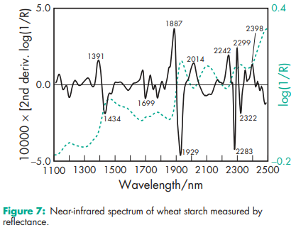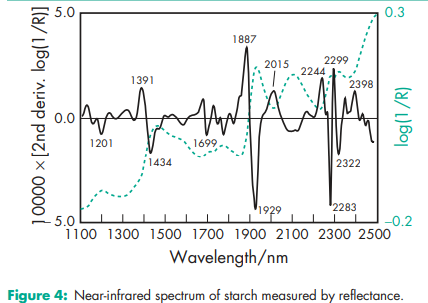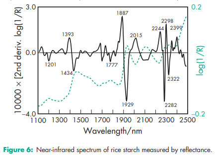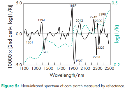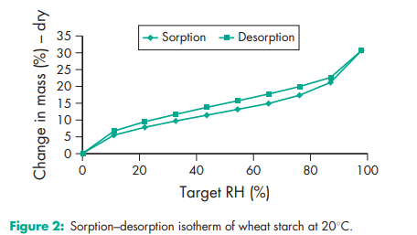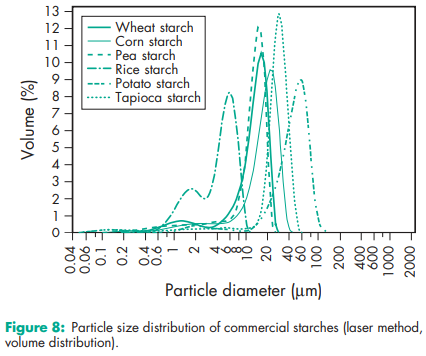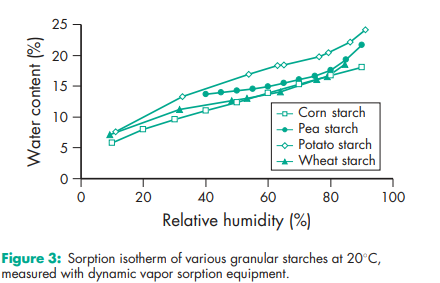Acidity/alkalinity Aqueous dispersions of starch usually have a pH in the range 4.0–8.0. Starch does not exhibit a significant self-buffering capacity. Amylose content 24–28% for corn starch; 35–39% for pea starch; 20–23% for potato starch; 17–20% for tapioca starch; 24–28% for wheat starch. Compactability see Figure 1. Density (bulk) (depending on the industrial process and humidity) 0.45–0.58 g/cm3 for corn starch;(20,30) 0.56–0.82 g/cm3 for potato starch;(20) 0.50 g/cm3 for wheat starch. Density (tapped) (depending on the industrial process and humidity) 0.69–0.77 g/cm3 for corn starch;(20) 0.80–0.90 g/cm3 for potato starch;(20) 0.76 g/cm3 for wheat starch. Density (true) 1.478 g/cm3 for corn starch. Flowability Commercial starch is generally cohesive and has poor flow characteristics. The flow properties depend strictly on the moisture content,(20,21) and drying can result in a free-flowing material. Gelatinization temperature (measured at 20% w/w in water with differential scanning colorimetry (peak)) 718C for corn starch; 628C for pea starch, 648C for potato starch; 688C for rice starch; 598C for wheat starch. Gelatinization causes the rupture of the starch grains and is an irreversible loss of the structure of the starch particle.(22) Moisture content All starches are hygroscopic and absorb atmospheric moisture to reach the equilibrium humidity.(23,24) The approximate equilibrium moisture is characteristic for each starch. At 50% relative humidity: 12% for corn starch; 14% for pea starch, 18% for potato starch; 14% for rice starch; 13% for wheat starch. Excessively dried starches with a humidity lower than the equilibrium humidity, are commercially available. These products should be stored in hermetically sealed containers to maintain their low moisture content. See also Figures 2 and 3. NIR spectra see Figures 4, 5, 6, and 7. Particle size distribution Corn starch: 2–32 mm; average particle diameter 13 mm; Pea starch: 5–90 mm; average particle diameter 30 mm; Potato starch: 10–100 mm; average particle diameter 46 mm; Rice starch: 2–20 mm; average particle diameter 5 mm; Tapioca starch: 5–35 mm; average particle diameter 13 mm; Wheat starch: 2–45 mm; bimodal particle size distribution, peak values approx. 2 mm and 20 mm Solubility Practically insoluble in cold ethanol (96%) and in cold water. Starch swells instantaneously in water by about 5–10% at 378C.(3) Starch becomes soluble in hot water at temperatures above the gelatinization temperature. Starches are partially soluble in dimethylsulfoxide and dimethylformamide. Specific surface area 0.40–0.54 m2 /g for corn starch.(8) Swelling temperature Swelling is a reversible process.(22) 648C for corn starch; 638C for potato starch; 728C for rice starch; 558C for wheat starch Viscosity (dynamic) Nonmodified starches are not the preferred polymer for regulating the viscosity of pharmaceutical preparations, except for clinical nutrition products. This is due to the physical and microbial instability of starch paste. In food applications, starch contributes to higher viscosity via the volume effect of the swollen particles and not with its dynamic viscosity. The viscosities of starch paste, obtained and measured under similar conditions may be ranked as follows: potato starch >> tapioca starch > corn starch. Note that aqueous starch dispersions show significant rheopexy, especially at concentrations above 40% w/w