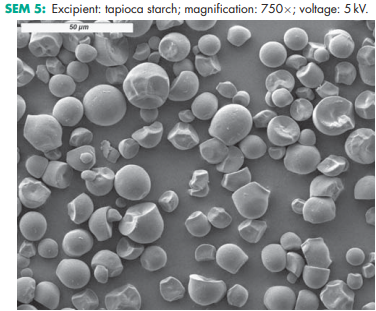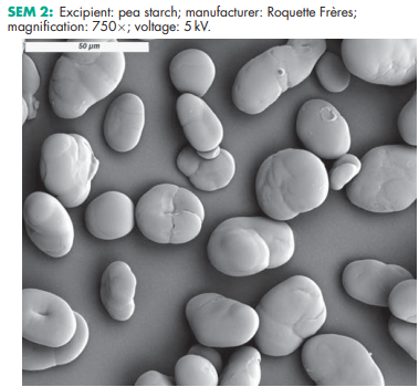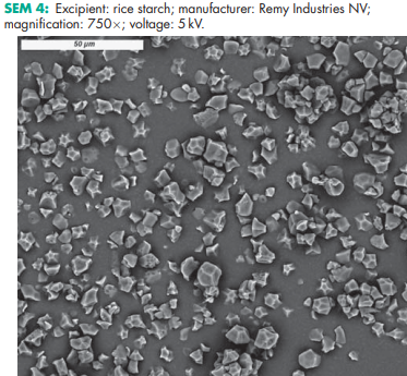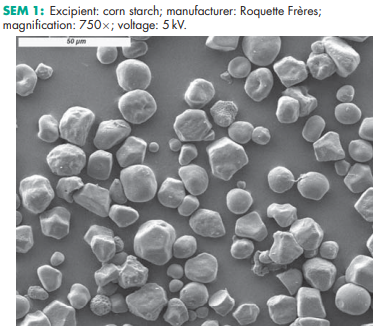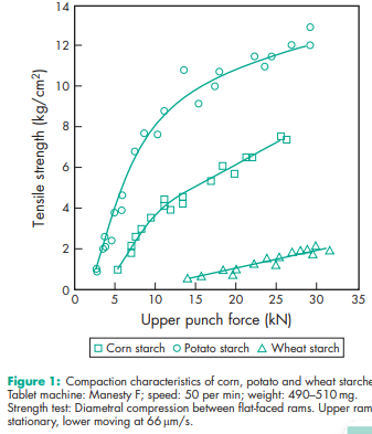 Starch is a versatile excipient used primarily in oral solid-dosage formulations where it is utilized as a binder, diluent, and disintegrant. As a diluent, starch is used for the preparation of standardized triturates of colorants, potent drugs, and herbal extracts, facilitating subsequent mixing or blending processes in manufacturing operations. Starch is also used in dry-filled capsule formulations for volume adjustment of the fill matrix,(1) and to improve powder flow, especially when using dried starches. Starch quantities of 3–10% w/w can act as an antiadherent and lubricant in tableting and capsule filling. In tablet formulations, freshly prepared starch paste is used at a concentration of 3–20% w/w (usually 5–10%, depending on the starch type) as a binder for wet granulation. The required binder ratio should be determined by optimization studies, using parameters such as tablet friability and hardness, disintegration time, and drug dissolution rate. Starch is one of the most commonly used tablet disintegrants at concentrations of 3–25% w/w;(2–7) a typical concentration is 15%. When using starch, a prior granulation step is required in most cases to avoid problems with insufficient flow and segregation. A starch– lactose compound has been introduced enabling the use of granular starch in direct compression, improving the tableting process and the disintegration time of the tablets.(8,9) However, starch that is not pregelatinized does not compress well and tends to increase tablet friability and capping if used in high concentrations;(10) see also Table I. Balancing the elastic properties of starch with adapted excipients has been shown to improve the compaction properties in tableting.(8,11) Starch, particularly the fine powders of rice and wheat starch, is also used in topical preparations for its absorbency of liquids. Starch paste is used in ointment formulations, usually in the presence of higher ratios of glycerin. Starch has been investigated as an excipient in novel drug delivery systems for nasal,(12) and other site-specific delivery systems.(13,14) The retrogradation of starch can be used to modify the surface properties of drug particles.(15) Starches are useful carriers for amorphous drug preparations, such as pellets with immediate or delayed drug release obtained, for example, by melt extrusion,(16,17) and they can improve the bioavailability of poorly soluble drugs. Starch, particularly rice starch, has also been used in the treatment of children’s diarrheal diseases. Specific starch varieties with a high amylose content (resistant starches) are used as insoluble fiber in clinical nutrition, and also for colon-targeting applications.(18) Due to their very high gelatinization temperature, these starches are used in extrusion/spheronization processes.(19) Starches with a high amylopectin content (waxy starches) are used as the starting material for the synthesis of hydroxyethyl starch, a plasma volume expander. Native starches conforming to pharmacopeial specifications are used as the raw materials for the production of starch-based excipients and active pharmaceutical ingredients, frequently covered with their own pharmacopeial monographs