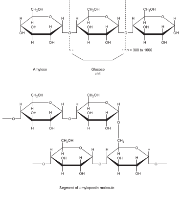 (C6H10O5)n where n = 300–1000. Starch consists of linear amylose and branched amylopectin, two polysaccharides based on a-(D)-glucose. Both polymers are organized in a semicrystalline structure, and in the starch granule, amylopectin forms the crystalline portion. The exact structure of starch is not yet fully understood. There is no specific distribution pattern of amylose and amylopectin molecules in the starch grain. Both molecules are organized in similar structures, probably as clusters according to the most recent scientifically recognized models. The different configurations of these molecules result in different behavior in cold aqueous solutions. Amylose (only linear 1,4 bonds) shows a high tendency for crystallization (retrogradation) resulting in insoluble adducts, whereas amylopectin (branched polymer) shows slow jellification, forming opaque and highly viscous preparations after some days. See also Sections 5 and 10. The molecular weight depends on the origin and the nature of the starch. It can range between 50 and 500 million Da, with amylopectin having a higher molecular weight than amylose.