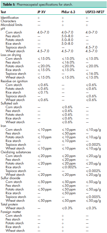 BP: Maize starch Potato starch Rice Starch Tapioca Starch Wheat Starch JP: Corn Starch Potato Starch Rice Starch Wheat Starch PhEur: Maize Starch Pea Starch Potato Starch Rice Starch Wheat Starch USP-NF: Corn Starch Potato Starch Tapioca Starch Wheat Starch
