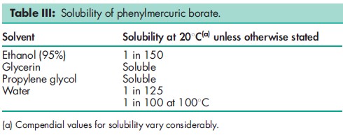 Acidity/alkalinity pH = 5.0–7.0 for 0.6% w/v aqueous solution at 208C. Antimicrobial activity Phenylmercuric borate is a broad-spectrum antimicrobial preservative with slow bactericidal and fungicidal activity similar to that of phenylmercuric nitrate; see Phenylmercuric Nitrate. Dissociation constant pKa = 3.3 Melting point 112–1138C Solubility see Table III.