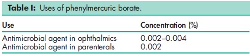 Phenylmercuric borate is mainly used as an antimicrobial preservative in topical pharmaceutical formulations. A number of adverse reactions to mercury-containing preservatives have been reported; see Phenylmercuric Nitrate. Although phenylmercuric borate is an irritant, it has been reported to be less so than either phenylmercuric acetate or phenylmercuric nitrate.(1) There is, however, some cross-sensitization potential with other mercurial preservatives. Systemic absorption has been reported following regular use of a hand disinfectant soap containing 0.04% phenylmercuric borate, resulting in an increase in the estimated total daily body load of mercury from 30–100 mg per 24 hours.(2)