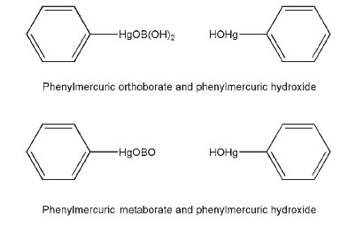 The PhEur 6.0 material is a compound consisting of equimolecular proportions of phenylmercuric hydroxide and phenylmercuric orthoborate (C12H13BHg2O4) or of the dehydrated form (metaborate, C12H11BHg2O3), or a mixture of the two compounds. Phenylmercuric hydroxide and phenylmercuric orthoborate: C12H13BHg2O4 633.2 Phenylmercuric hydroxide and phenylmercuric metaborate: C12H11BHg2O3 615.2
