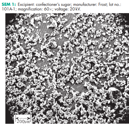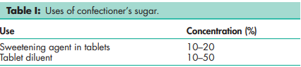 Confectioner’s sugar is not widely used in pharmaceutical formulations because the poor-flow characteristics prevent its use in directcompression blends. However, confectioner’s sugar is used when a smooth mouth feel or a rapidly dissolving sweetener is required, and when a milled/micronized active ingredient must be blended with a diluent of similar particle size for powders or wet granulations. Low-starch grades of confectioner’s sugar containing 0.01% w/w starch are also commercially available.