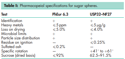 The USP32–NF27 describes sugar spheres as approximately spherical granules of a labeled nominal-size range with a uniform diameter and containing not less than 62.5% and not more than 91.5% of sucrose, calculated on the dried basis. The remainder is chiefly starch. The PhEur 6.3 states that sugar spheres contain not more than 92% of sucrose calculated on the dried basis. The remainder consists of corn (maize) starch and may also contain starch hydrolysates and color additives. The diameter of sugar spheres varies from 200 to 2000 mm, and the upper and lower limits of the size of the sugar spheres are stated on the label