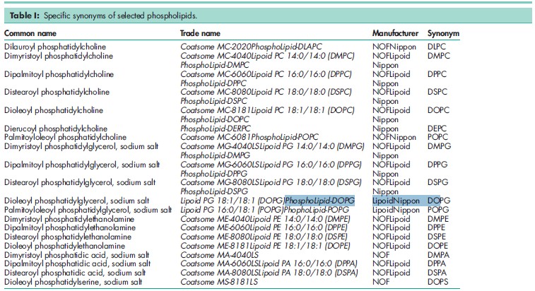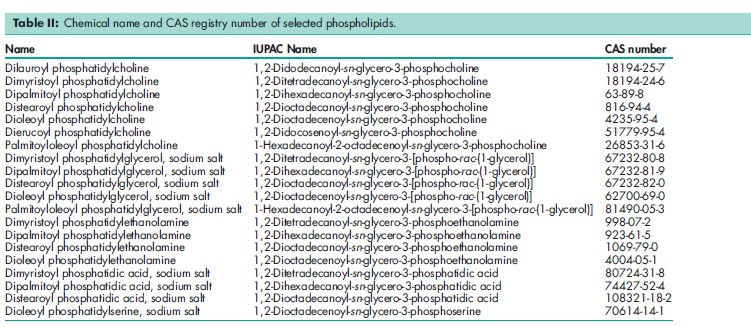 Coatsome; glycerol phosphatides; Lipoid; phosphatides; phosphatidic acid; phosphatidylcholine; phosphatidylethanolamine; phosphatidylglycerol; phosphatidylinositol; phosphatidylserine; phosphoglycerides; PhosphoLipid; purified egg yolk PC; sphingomyelin. See also Table I.