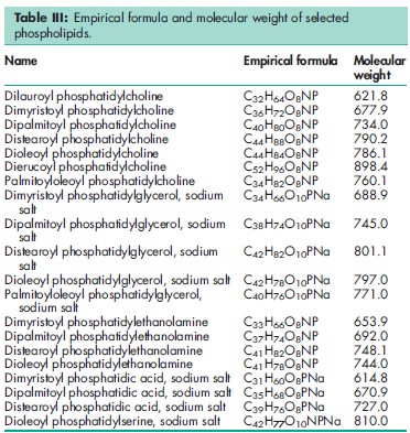 Phospholipids are amphiphilic molecules and are the major component of most cell membranes.(2) They are able to selfassociate and form a variety of structures, including micelles and liposomes.(3) Numerous pharmaceutical formulations use phospholipids to form various types of liposomes, including unilamellar (one bilayer membrane surrounding an aqueous chamber), multilamellar (two or more concentric membranes, each surrounding an aqueous chamber), and multivesicular (numerous aqueous chambers joined in a honeycomb-like arrangement) liposomes.(4) Modified phospholipids have been used to enhance the properties of the resulting liposomes. The covalent attachment of polyethylene glycol (PEG) to the phospholipid, or PEGylation, provides steric hindrance to the surface of the liposomes, resulting in decreased uptake by the reticuloendothelial system (RES), also known as the mononuclear phagocyte system, and a prolonged circulation half-life following intravenous administration; the so-called ‘stealth liposomes.’(5) Conjugation with antibodies produces immunoliposomes, which are able to target specific cell types and deliver a payload of encapsulated drug.(6) Phospholipids can be anionic, cationic, or neutral in charge. Because of their amphiphilic nature, phospholipids will associate at hydrophobic/hydrophilic interfaces. The charged lipids can be used to provide electrostatic repulsion and physical stability to suspended particles. Thus, they have been used to physically stabilize emulsions and suspensions.(7,8) Phospholipids have also been used in formulations administered as lung surfactants, in intravenous fat emulsions, and in oral solutions (e.g. Rapamune).