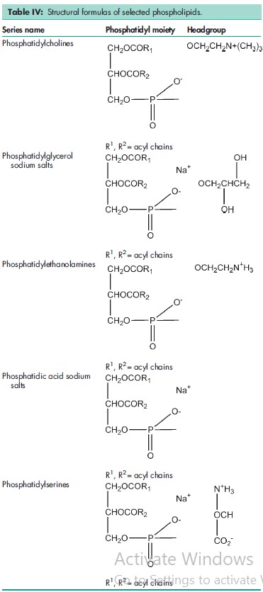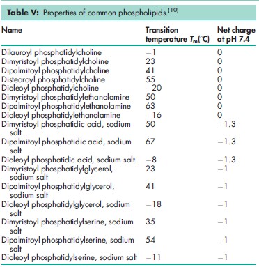 Phospholipids are amphiphilic, surface-active molecules with a high tendency to form aggregates (phases) both in the dry state and when fully hydrated. The temperature of transition from crystalline to mesomorphic (liquid crystalline) state is the transition temperature (Tm).(9) See Table V. Most phospholipids are freely soluble in organic solvents.
