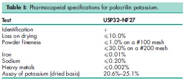 Polacrilin potassium is a cation-exchange resin used in oral pharmaceutical formulations as a tablet disintegrant.(1–3) Concentrations of 2–10% w/w have been used for this purpose, although 2% w/w of polacrilin potassium is usually sufficient. Other polacrilin ion-exchange resins have been used as excipients to stabilize drugs, to mask or modify the taste of drugs, and in the preparation of sustained-release dosage forms(4) and drug carriers. Polacrilin resins are also used in the analysis and manufacture of pharmaceuticals and food products.