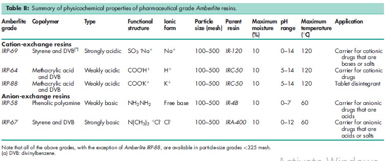 A number of other polacrilin (Amberlite) resins are commercially available that have a variety of industrial and pharmaceutical applications; see Table II.