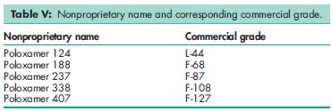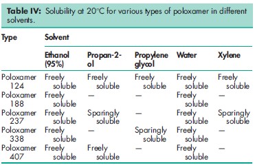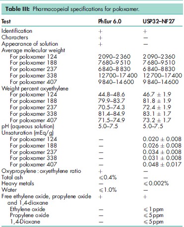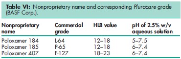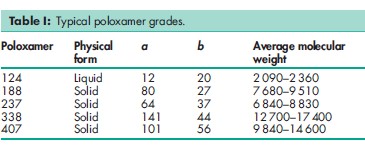 The poloxamer polyols are a series of closely related block copolymers of ethylene oxide and propylene oxide conforming to the general formula HO(C2H4O)a(C3H6O)b(C2H4O)aH. The grades included in the PhEur 6.0 and USP32–NF27 are shown in Table I. The PhEur 6.0 states that a suitable antioxidant may be added.
