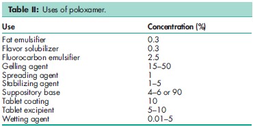 Poloxamers are nonionic polyoxyethylene–polyoxypropylene copolymers used primarily in pharmaceutical formulations as emulsifying or solubilizing agents.(1-8) The polyoxyethylene segment is hydrophilic while the polyoxypropylene segment is hydrophobic. All of the poloxamers are chemically similar in composition, differing only in the relative amounts of propylene and ethylene oxides added during manufacture. Their physical and surface-active properties vary over a wide range and a number of different types are commercially available; see Sections 4, 9, 10 and 18. Poloxamers are used as emulsifying agents in intravenous fat emulsions, and as solubilizing and stabilizing agents to maintain the clarity of elixirs and syrups. Poloxamers may also be used as wetting agents; in ointments, suppository bases, and gels; and as tablet binders and coatings. Poloxamer 188 has also been used as an emulsifying agent for fluorocarbons used as artificial blood substitutes, and in the preparation of solid-dispersion systems. More recently, poloxamers have found use in drug-delivery systems.(9–14) Therapeutically, poloxamer 188 is administered orally as a wetting agent and stool lubricant in the treatment of constipation; it is usually used in combination with a laxative such as danthron. Poloxamers may also be used therapeutically as wetting agents in eye-drop formulations, in the treatment of kidney stones, and as skin-wound cleansers. Poloxamer 338 and 407 are used in solutions for contact lens care. See Table II.